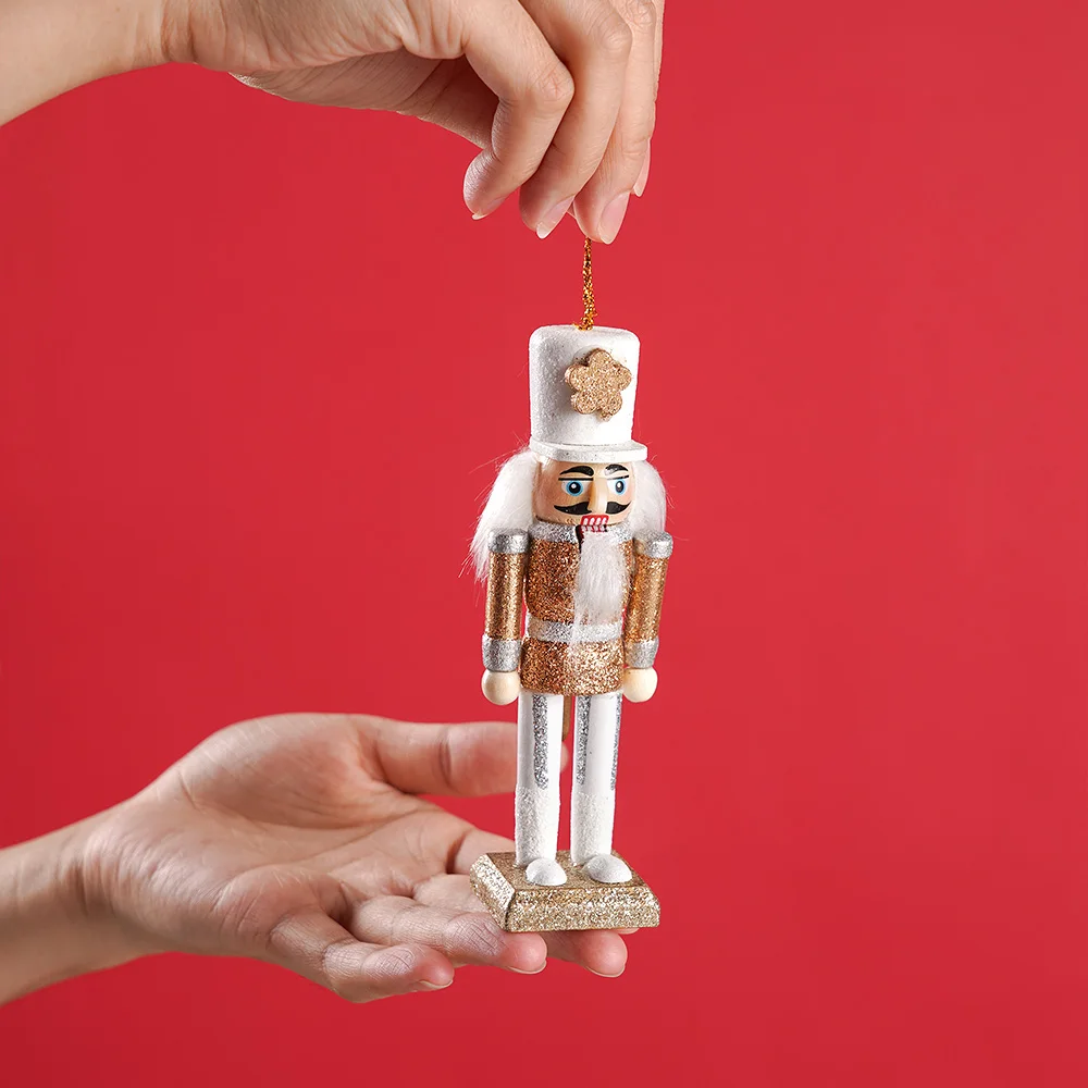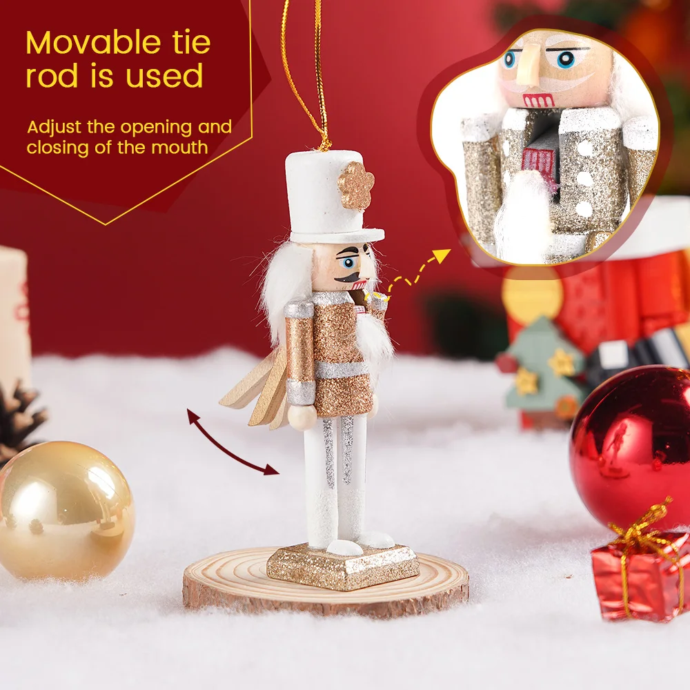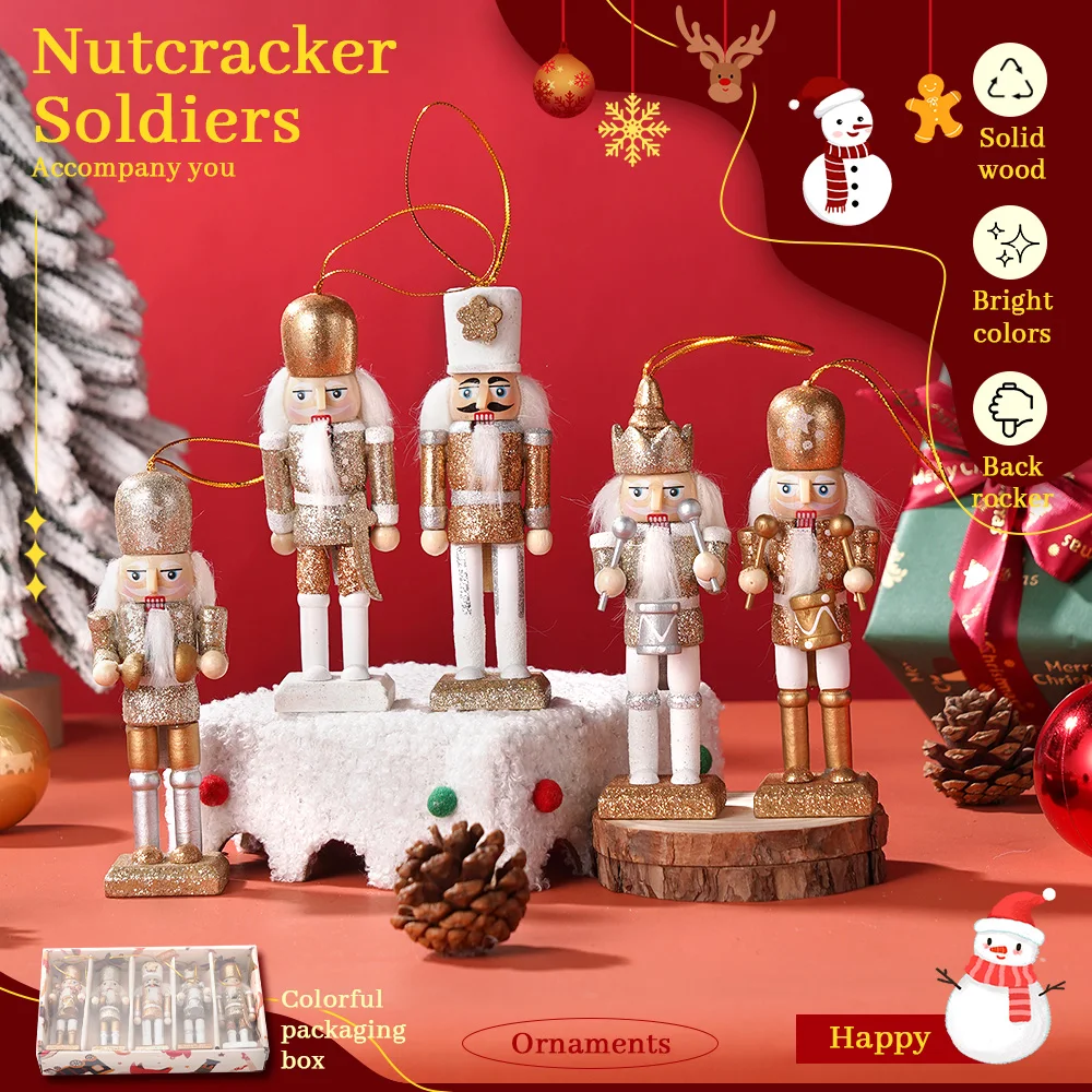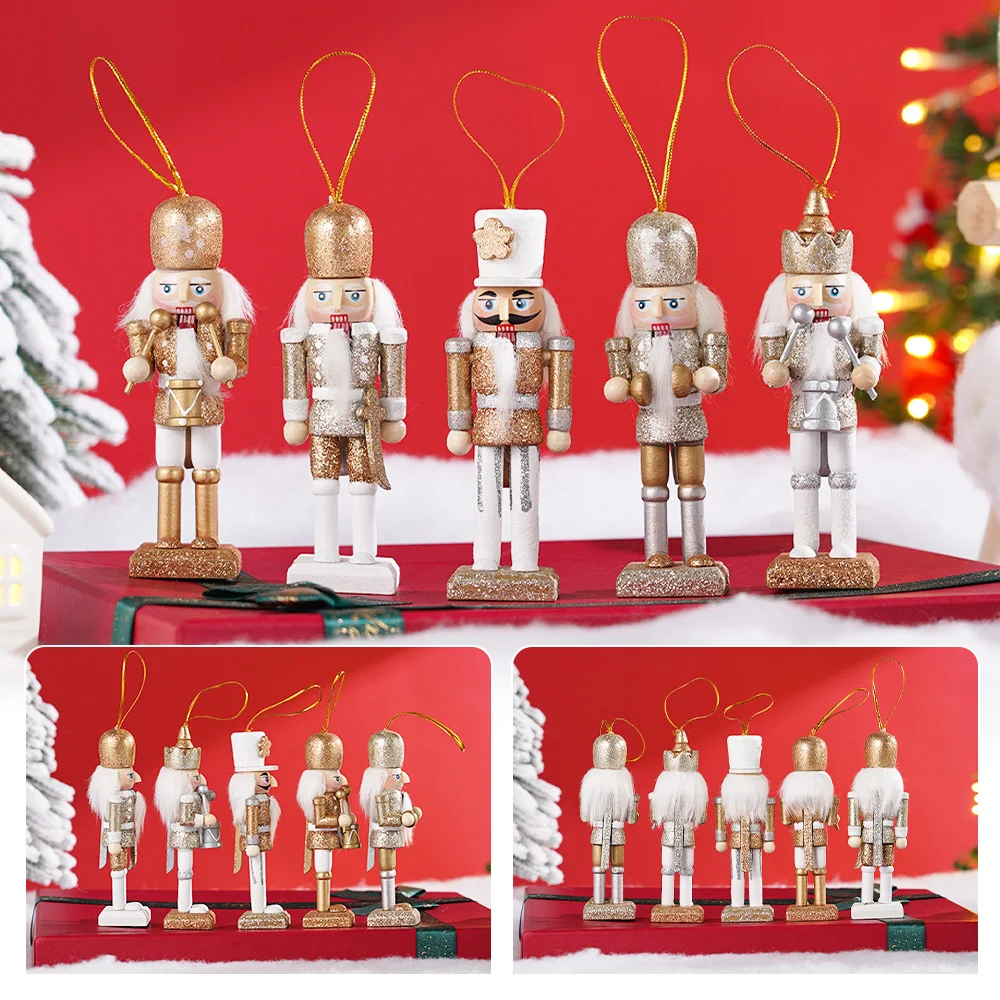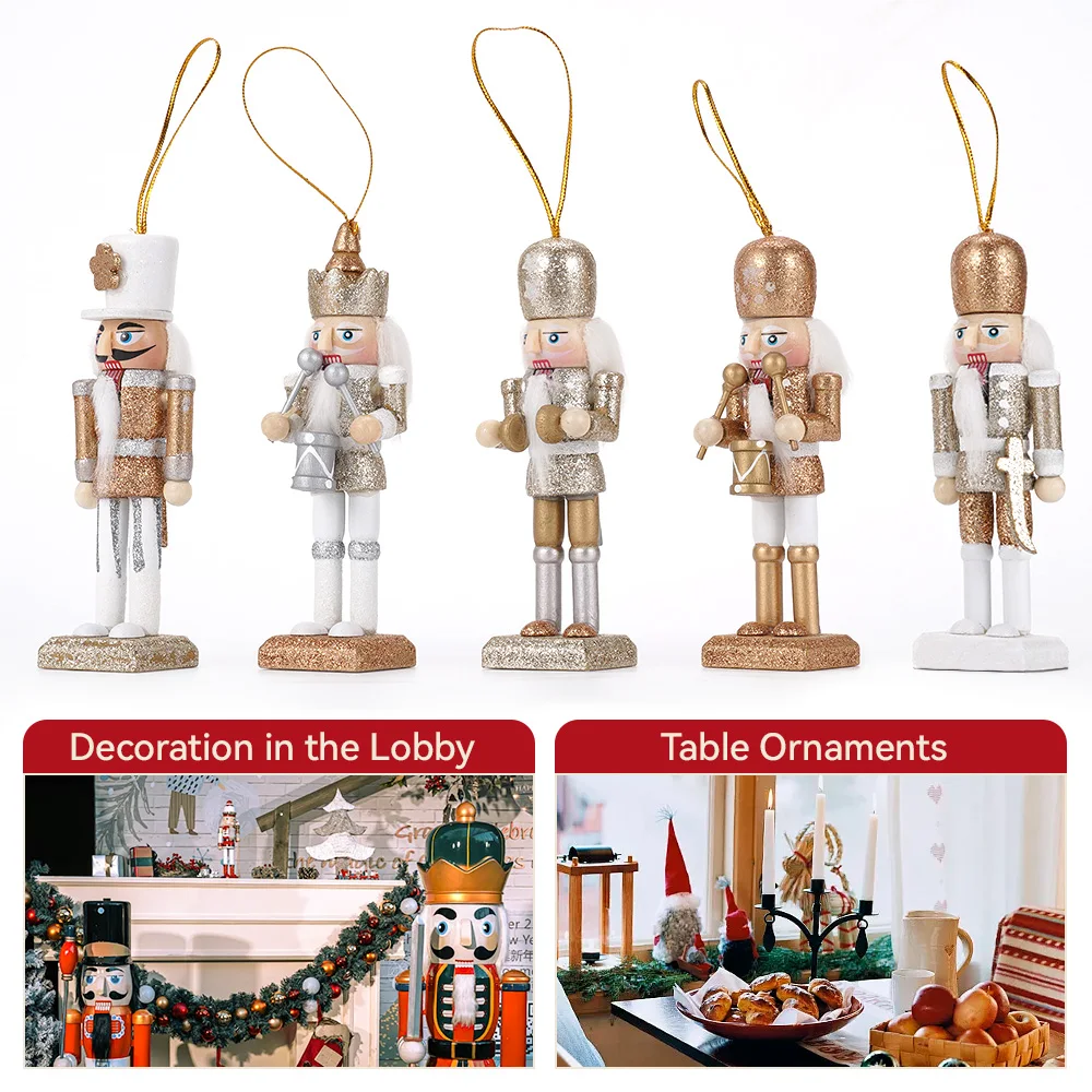 5 Pcs 12Cm H Christmas White Gold Dome Nutcracker Soldier Puppet Wooden Doll Christmas Tree Shiny Pendant New Year Home Decor