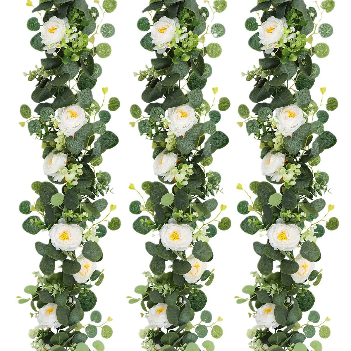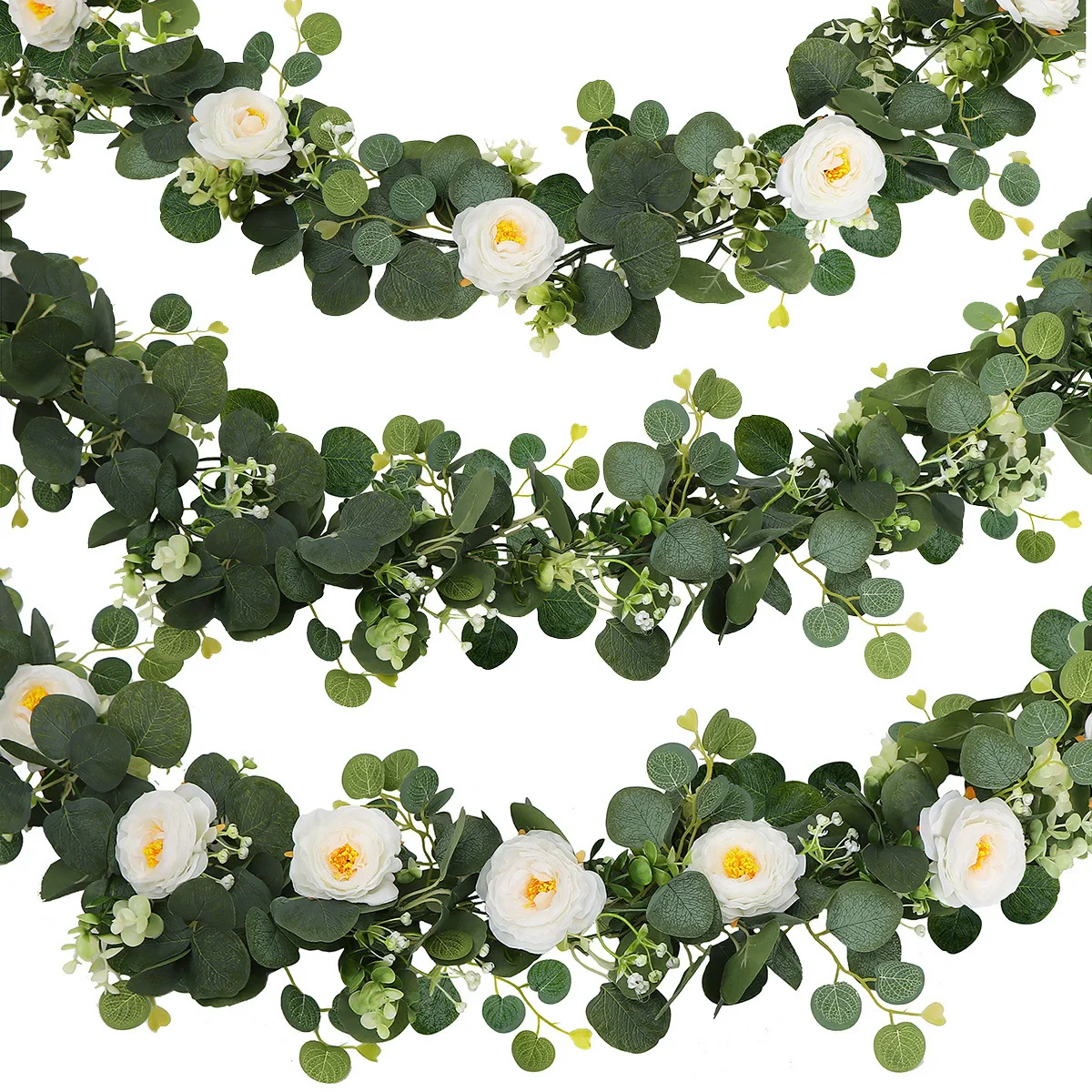 Lush 70.8" Faux Eucalyptus Garland with White Flowers - Perfect for Home & Holiday Decor, Wall Hanging, Yard, and Party Accents
